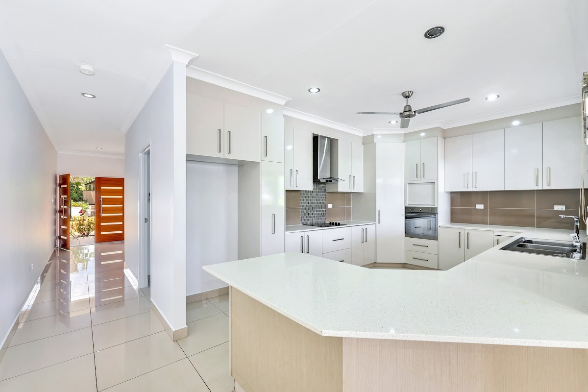 Further into the home is the generous open plan living, dining and kitchen areas with tiled flooring underfoot and A/C as standard. Double opening sliding doors showcase the verandah and poolside entertaining areas with some easy care gardens and lawns around the home. Within the backyard is a striking variegated pandanus and easy care tropical gardens framing the blue depths of the in ground swimming pool.