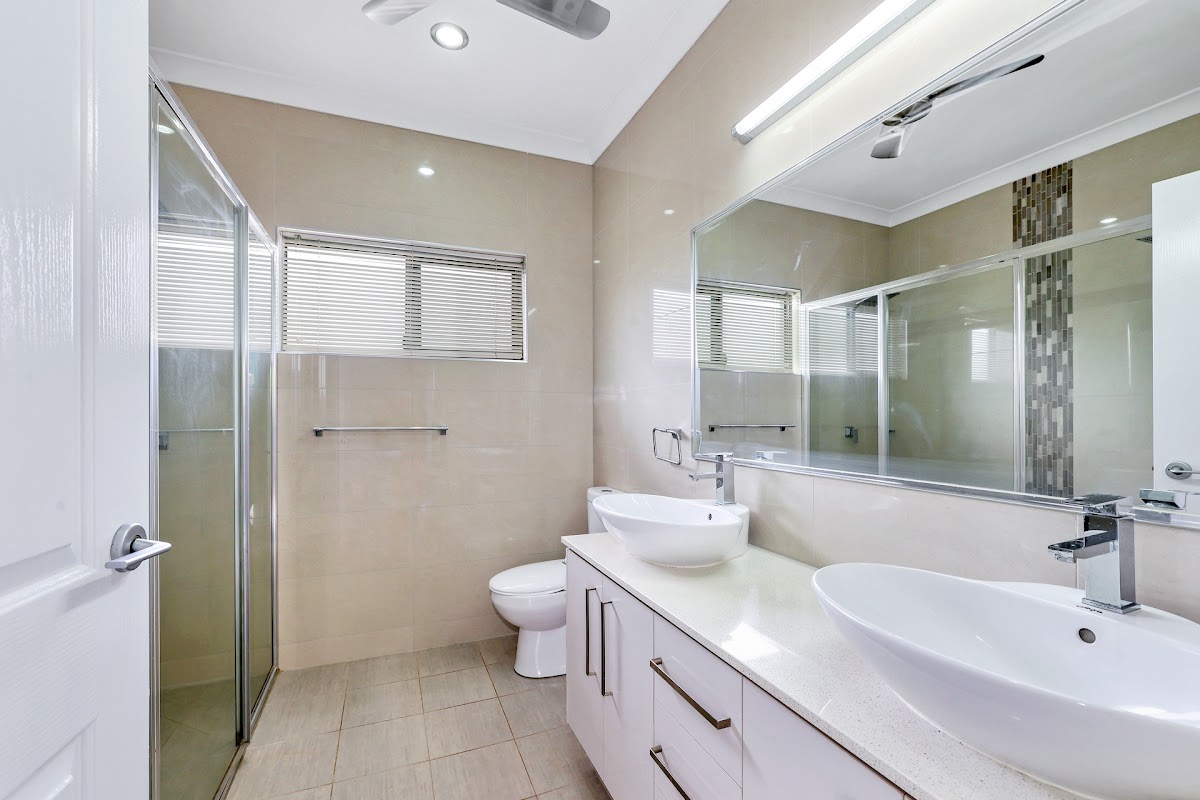 The master bedroom suite includes a walk in robe and ensuite bathroom with twin vanity and glass framed showers. The main bathroom includes a bath tub and separate shower along with a separate powder room and a wall of storage hosted adjacent for all the additional linens.
