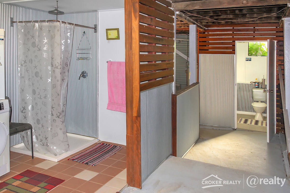 Practical additions include a concrete driveway, undercover parking, garden shed, a high-clearance carport ideal for a caravan, and a workshop with roller door al with concrete flooring. Under the home, you’ll find more storage, the laundry, and additional bathroom facilities.