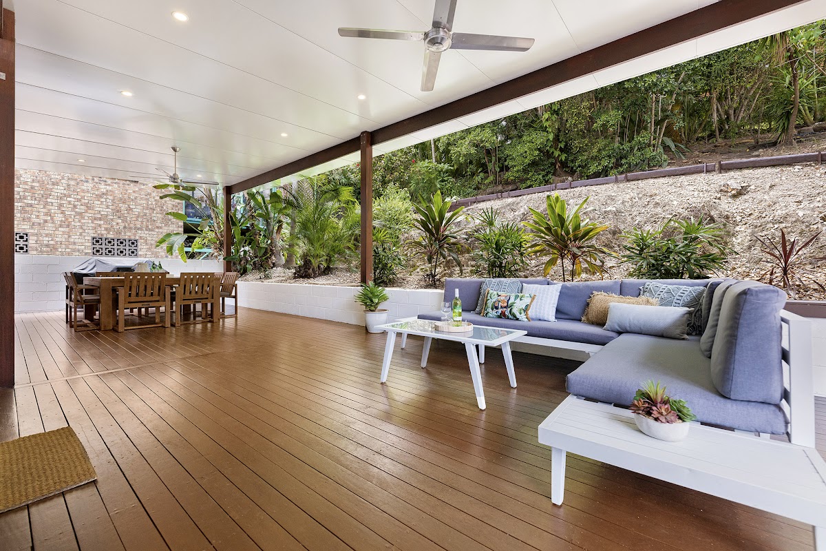 * Beautiful full-length rear deck cover with insulated roof, ceiling fan, and down lights