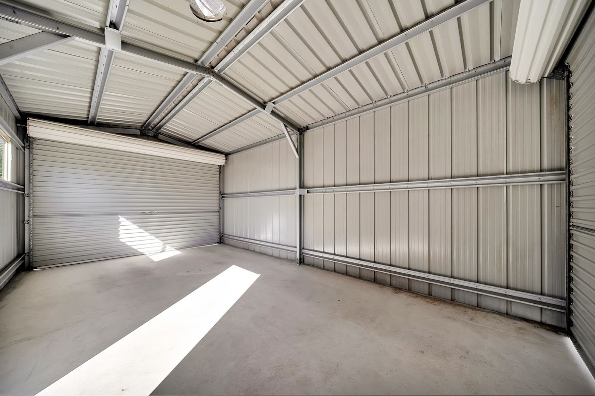 There is a high-clearance single-bay garage / shed / workshop, with vehicle access at front and rear.