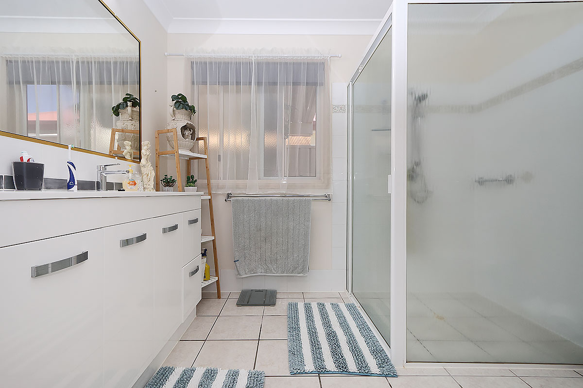 The spacious bathroom features double sink vanity, generous storage, frosted glass shower and with the convenience of a second separate toilet off the laundry.
