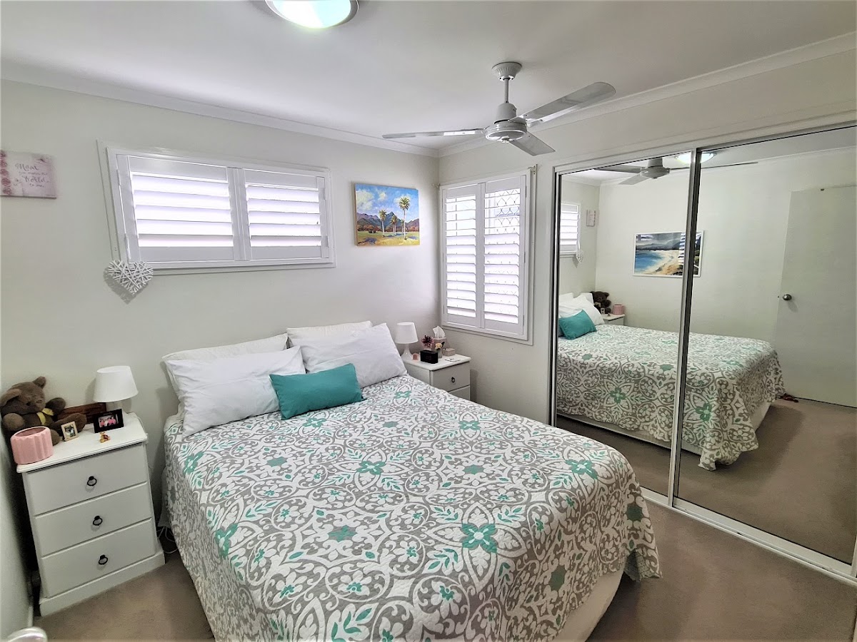 Both bedrooms have ceiling fans and built-in wardrobes with mirrored doors.