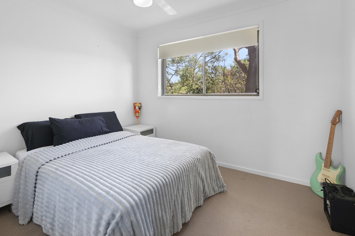 The large master bedroom offers enhanced privacy, a mirrored walk-through robe, and a private ensuite. There are two additional bedrooms, both fitted with built-in robes and ceiling fans. The main bathroom includes both a shower and a separate bathtub.