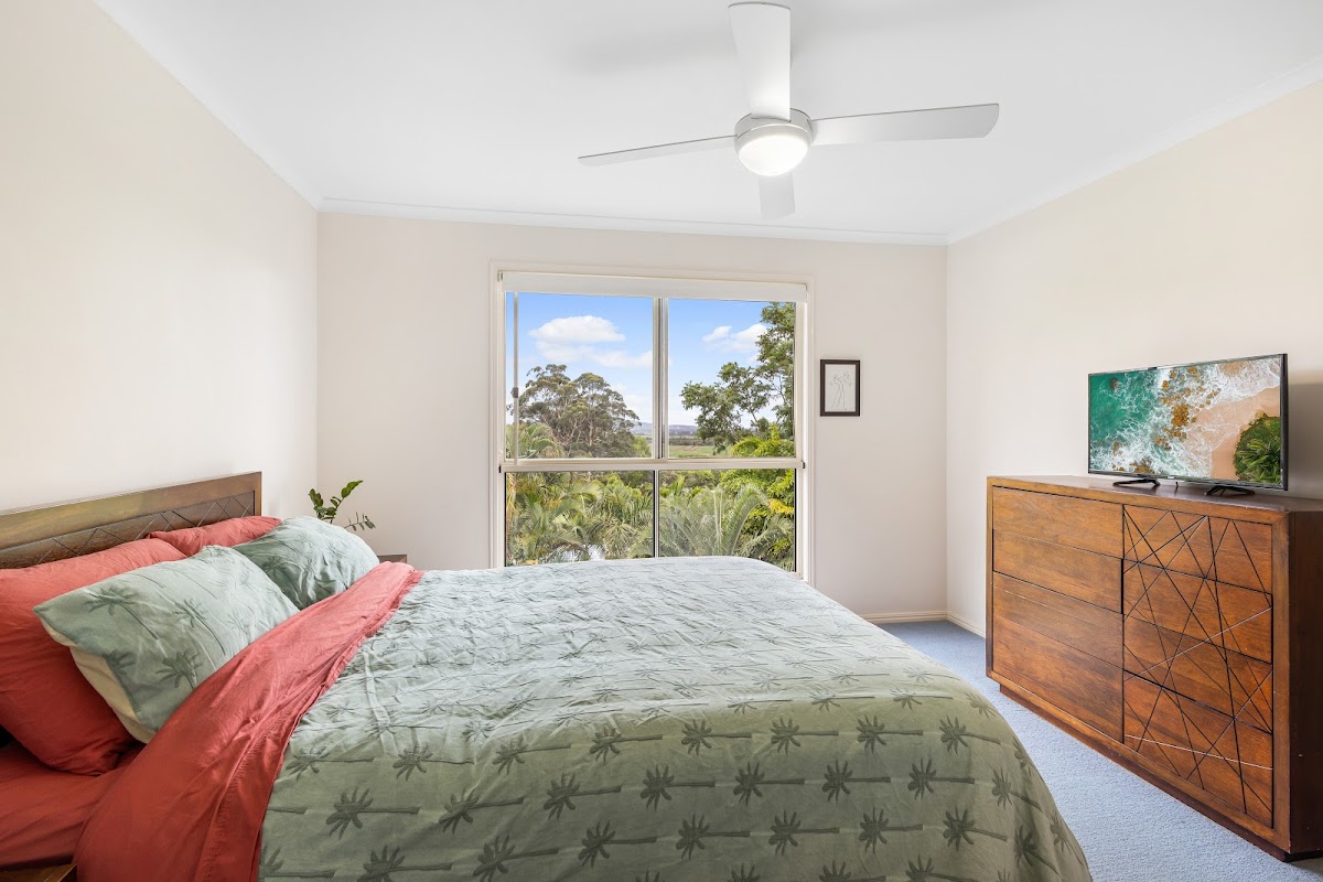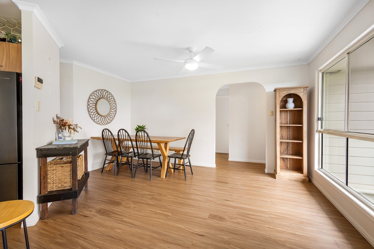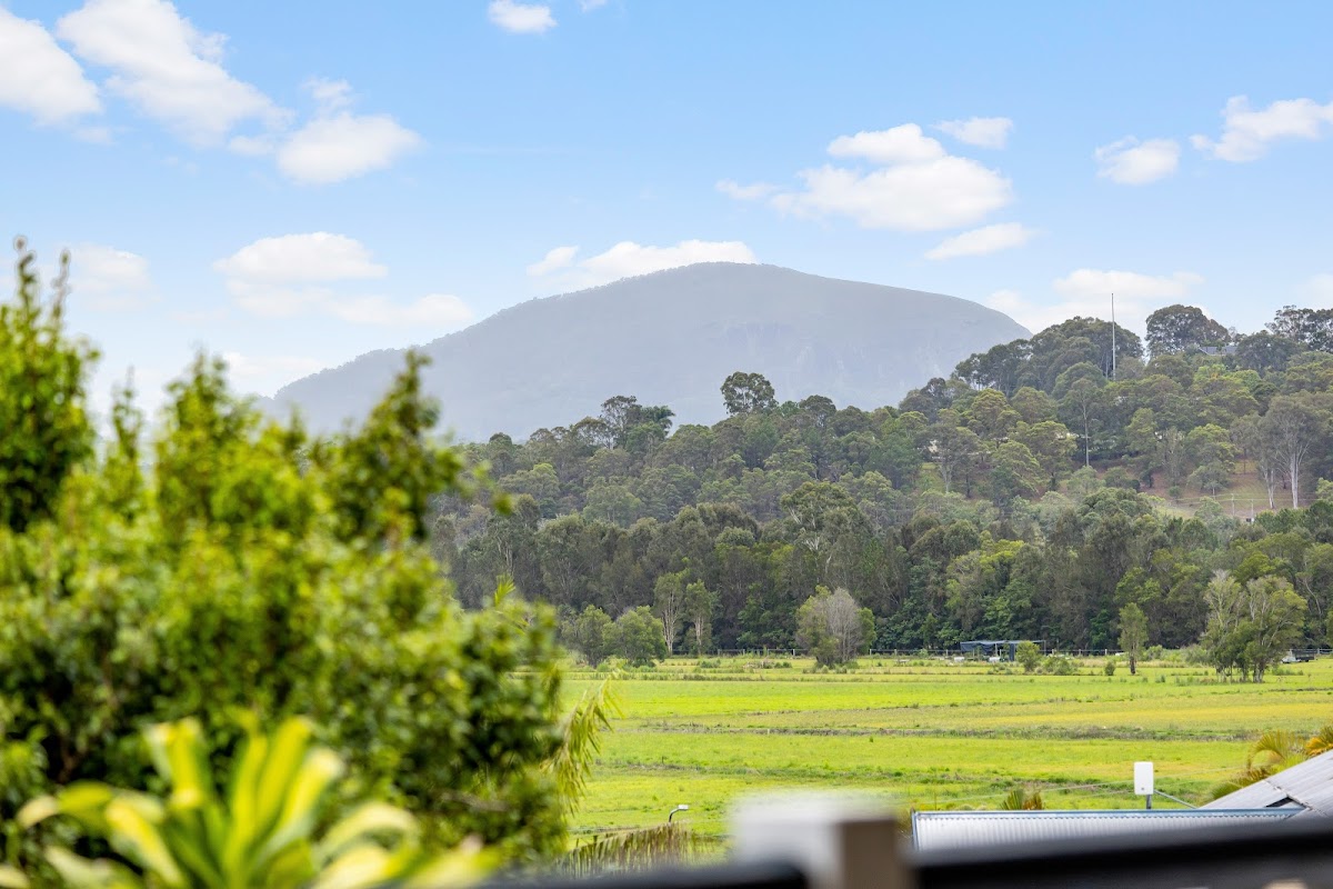 The dining room spills out onto the covered deck, overlooking the spacious back yard with stunning views of rural Bli Bli, Mount Coolum and Mt Ninderry.