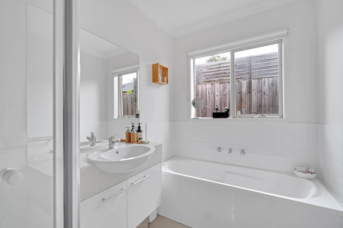 The main bathroom of the home has high quality fixtures and fittings as well as a bath tub.