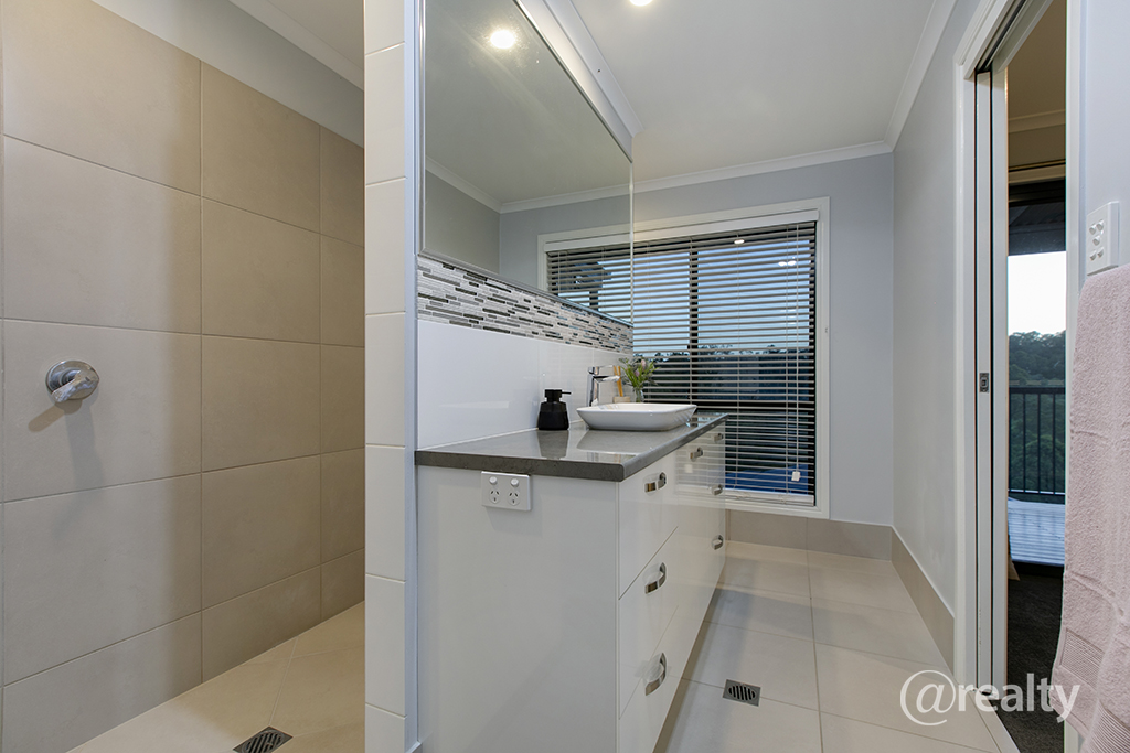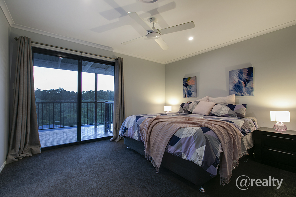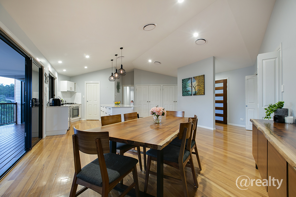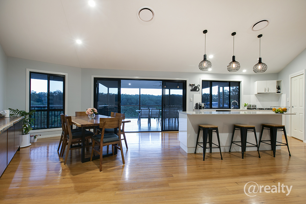 The entry into this fabulous architecturally designed family home brings you into the hub of the home where you are greeted by high pitched ceilings. A generous galley kitchen offering Caesar Stone bench tops, 4 burner gas cooktop, stainless steel appliances and a massive walk in pantry which will have the chef in the family cooking up a storm in ducted air-conditioned comfort. There is plenty of room to come together around the island bench and chat while dinner is cooking. The expansive open plan living space then flows seamlessly out to the alfresco entertaining deck allowing you to take advantage of those gorgeous breezes whilst enjoying the uninterrupted view, making it the perfect spot to entertain friends and family. No matter what time of the day it is you can relax in the peace and serenity of nature whilst enjoying that morning coffee or afternoon beer and champers.