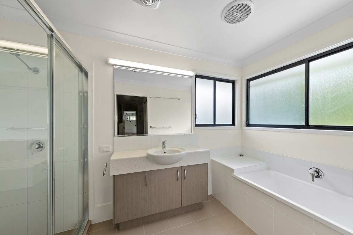 Upstairs: Two (2) good size bedrooms – master with a generous size ensuite. Sparkling main bathroom with separate bath and shower – conveniently located beside second bedroom (virtual ensuite). Third room (shown on floorplan as study) can be converted to extra living/media or could easily convert to a third bedroom.