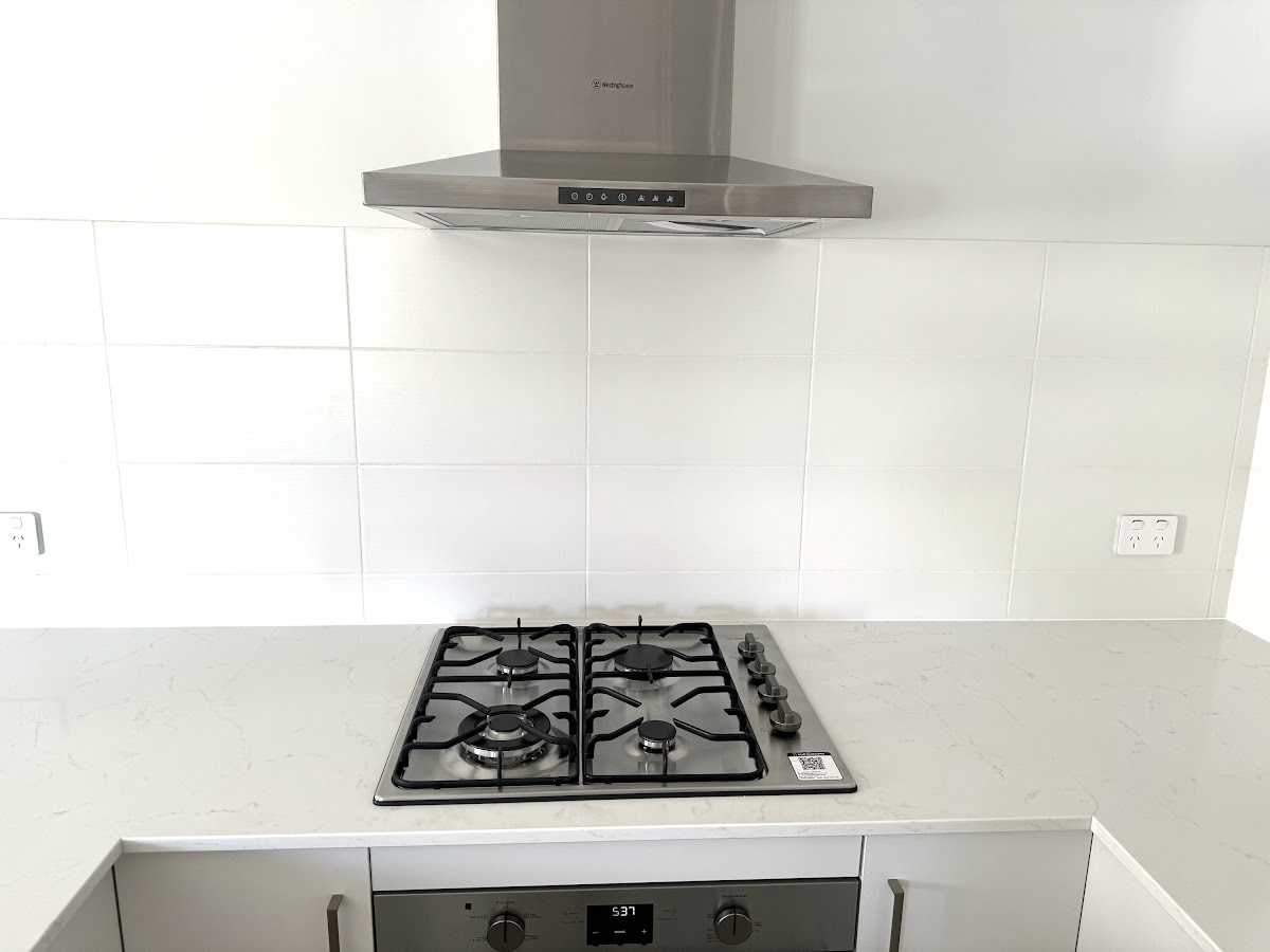 Modern kitchen with white stone bench tops, trendy tiled splashback
