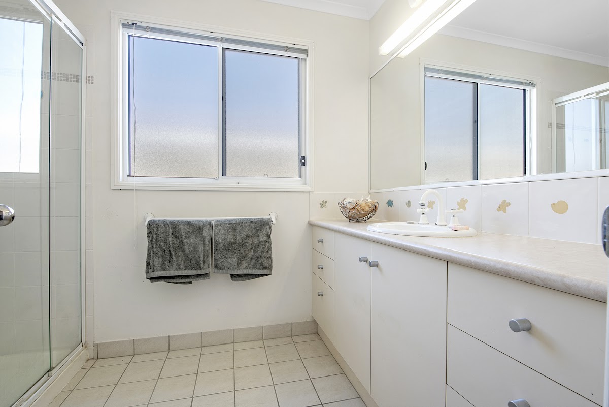 This home has the lovely high ceilings in the spacious open plan living area and the adjacent kitchen overlooks the water for lovely views – no complaints about doing dishes here! The kitchen has plenty of bench space, cupboards and there are plenty of drawers – so modern and easy to find items. The cooktop is gas and the oven is electric. There is a dishwasher, wide benchtops and easy access to the deep corner sections of the cupboards. Such a great kitchen to work in and create plenty of culinary delights.