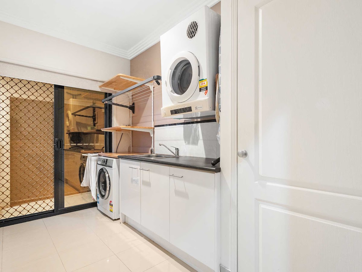 The double garage has internal access to the home, and an extra-high ceiling which allows the height for rows of storage shelving. Outside the laundry glass sliding door, under a covered breezeway, is a fantastic storage shed (approx. 7.5m x 1.5m) with rolladoor access at each end, ideal for garden tools and a workshop.