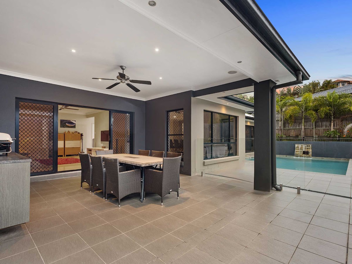 Boasting gated side access for securely parking a boat, camper trailer or 3rd vehicle, a perfect Northerly aspect into all 4 living areas and across the private pool and alfresco, plus soaring 9-foot ceilings and ducted air-conditioning throughout, this enormous 36 SQ (335sqm) lowset home elevated on an 800sqm block, features 4 generous bedrooms and a study (or 5th bedroom). The black granite gourmet kitchen and living areas (lounge, meals, family and rumpus) all look out over the alfresco and private pool area (with cascading water-feature) so you can keep an eye on children swimming from inside the home.