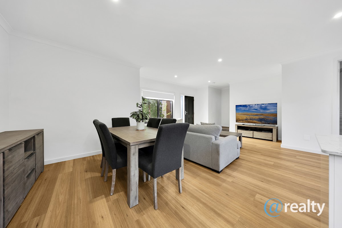 The meals area sits openly between the living zone and kitchen, with a sliding door drawing you