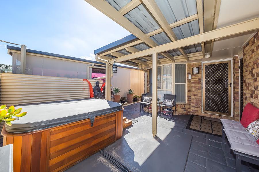 This home is a great low set two bedroom duplex situated on a 450 sqm block overlooking the canal and boasts two living areas and open plan kitchen/dining/living. An enormous living area with high ceilings which leads out to the covered outdoor entertainment area overlooking the water has recently been added. A fireplace adds additional cosiness. The garage has been converted to an additional study/guest room and a private courtyard leads into the front entry with an outside spa bath housed in that area.
