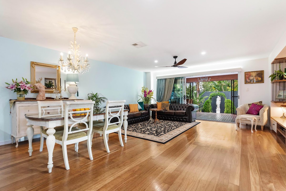 Open plan living and dining areas, with striking timber flooring and plantation shutters adding to the elegance of the home.