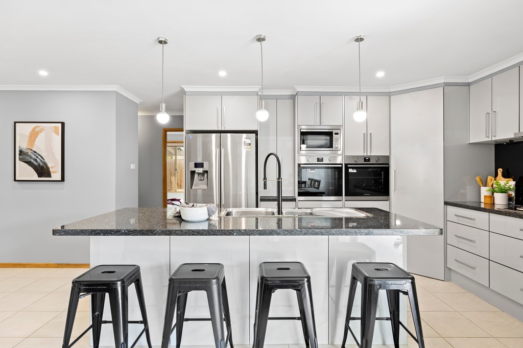 One of the living rooms upon entry welcomes you inside, with the adjoined study providing a versatile space. Stepping through to the expansive open plan family zone, there is ample room for all, with direct access to the backyard through double sliding doors. Gourmets will adore the sparkling modern kitchen, boasting stone surfaces, island bench, breakfast bar, glass splashbacks and dual wall ovens. Generous in size, the main bedroom features a walk-in robe and ensuite, while two further bedrooms include built-in robes and are serviced by the tidy family bathroom.