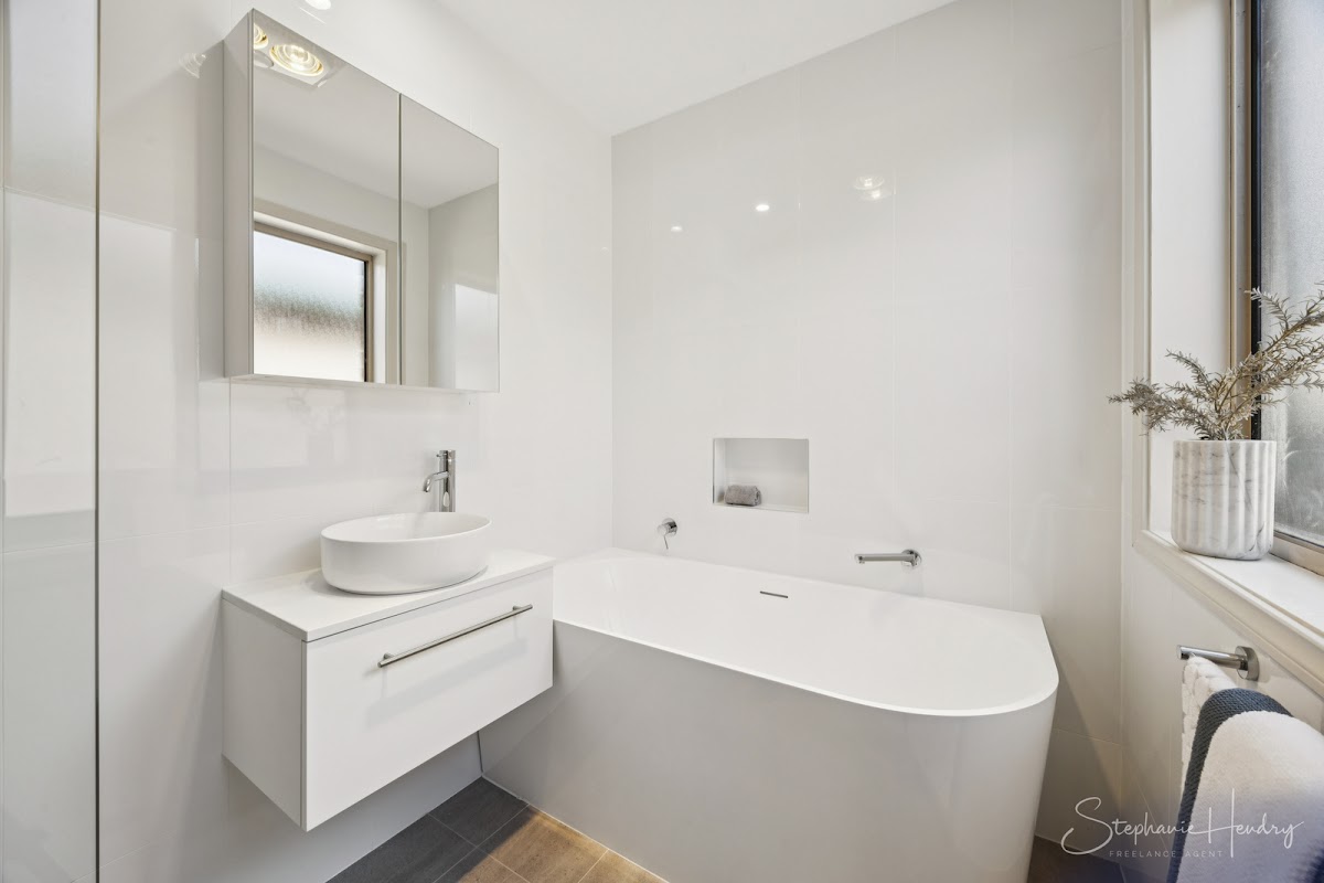 Beautifully newly renovated, modern bathroom with freestanding bath and walk in shower, suspended vanity