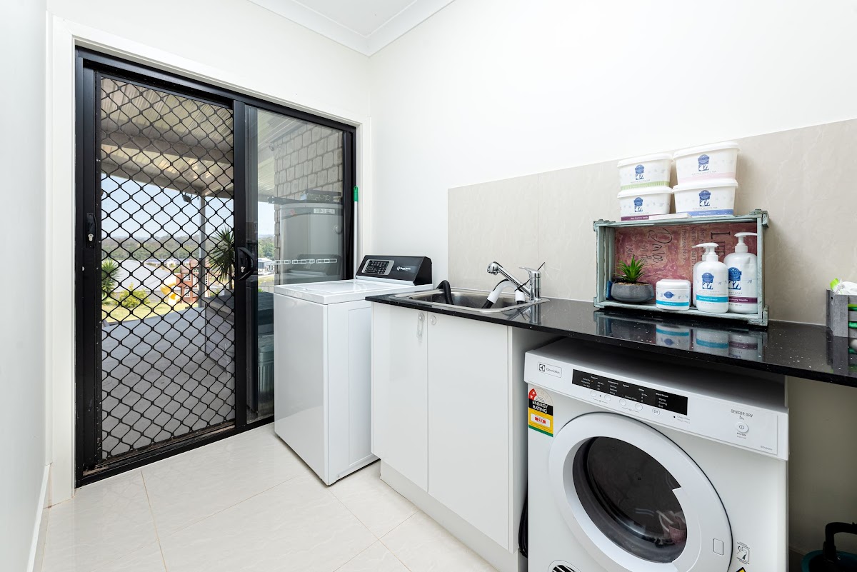 – Separate laundry with stone benches!