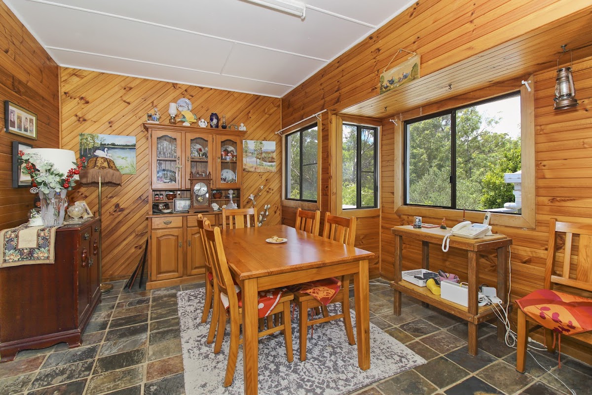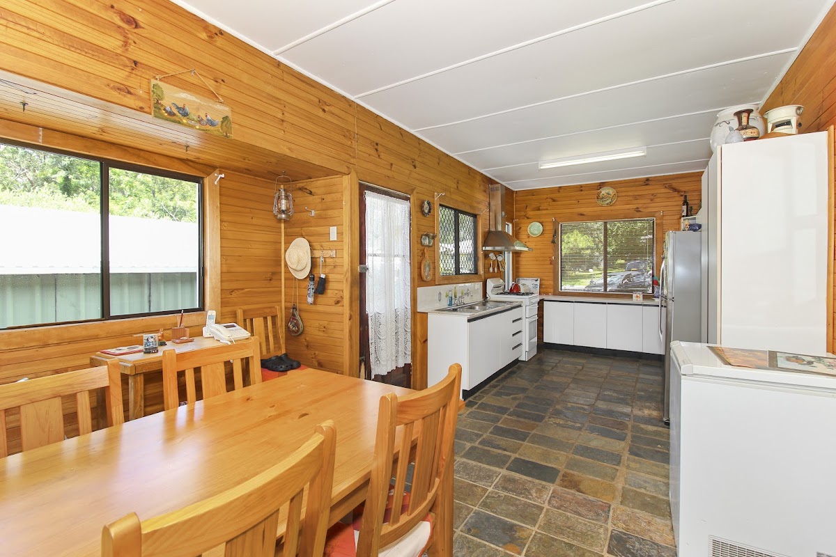 * Combined functional kitchen and dining room featured with timber walls.