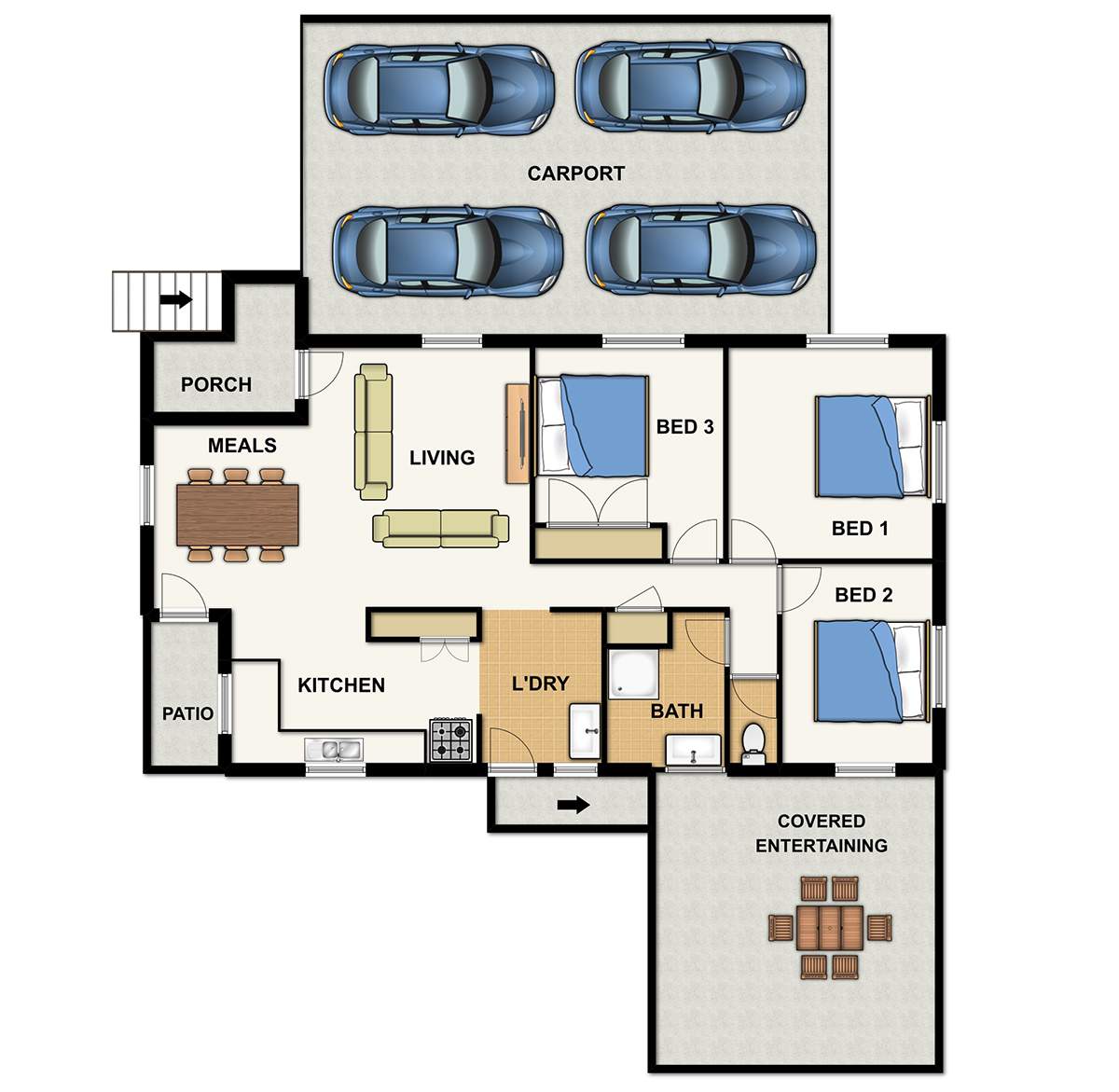 Under cover entertaining area doubles as 2 car covered carport,
