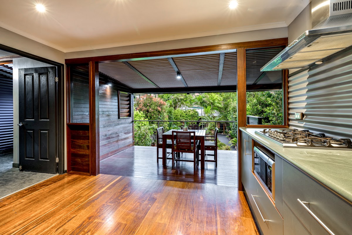 Stepping into this light-filled modern Queenslander provides a perfect place for entertaining or unwinding, as well as a large patio area that combines indoor and outdoor living in a seamless manner.