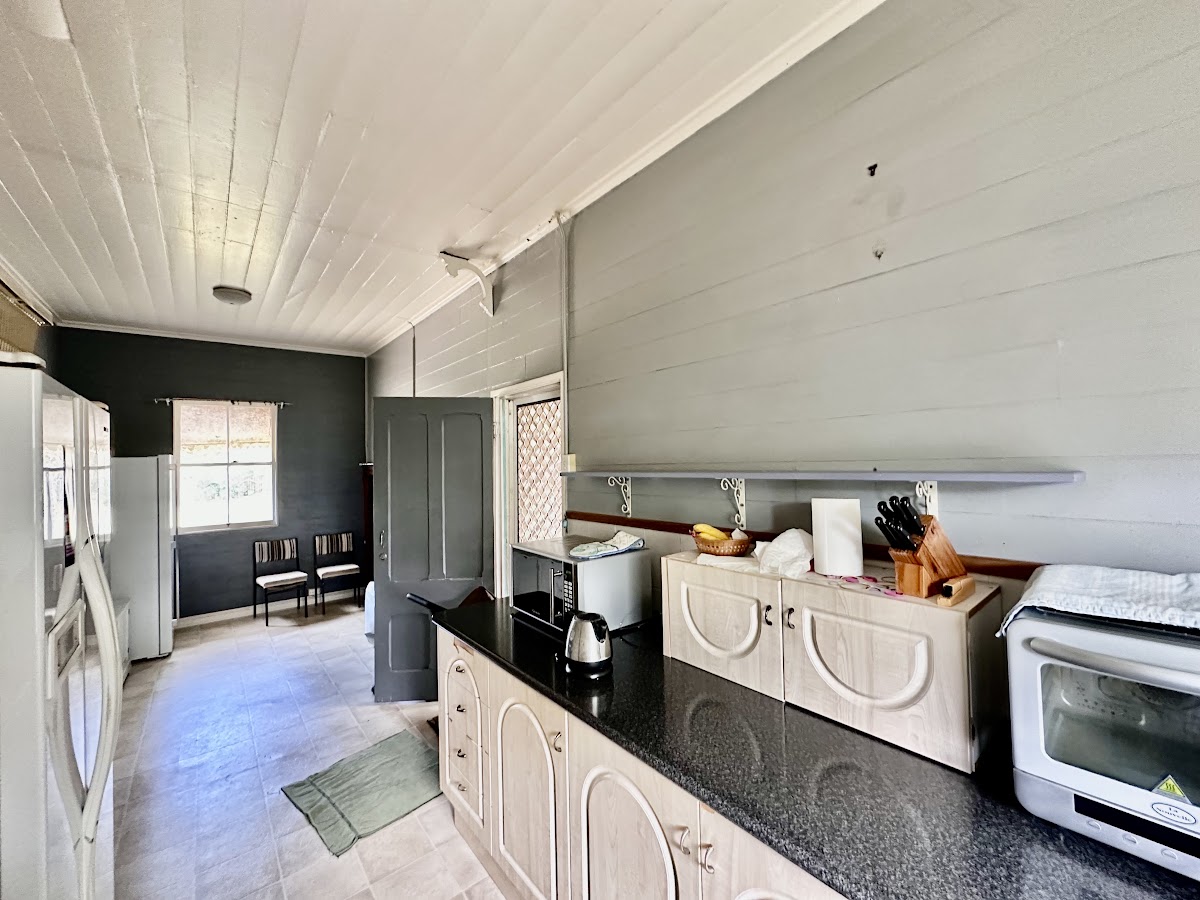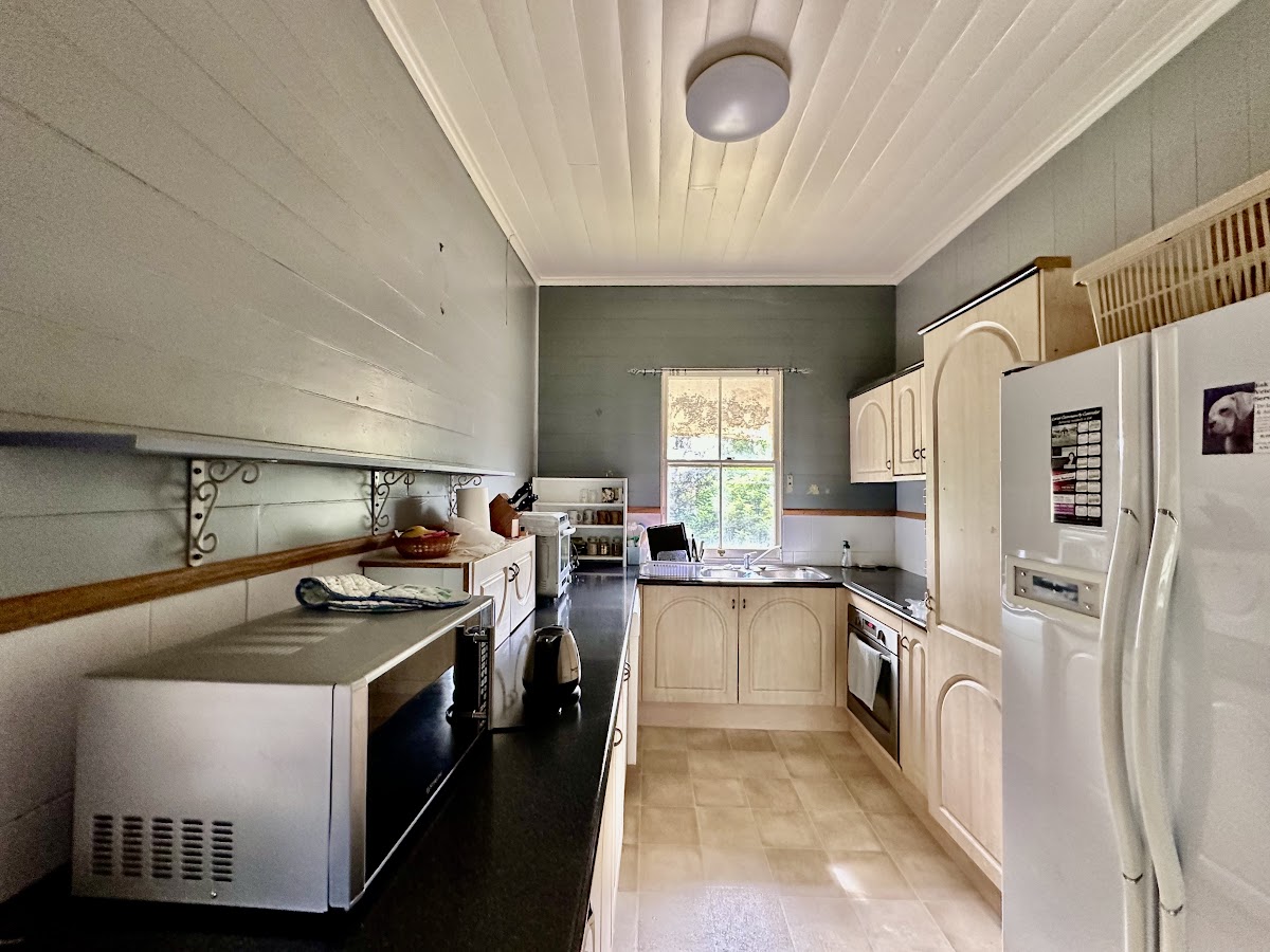 Long galley kitchen still has the original wood stove ( unfortunately not in working condition)
