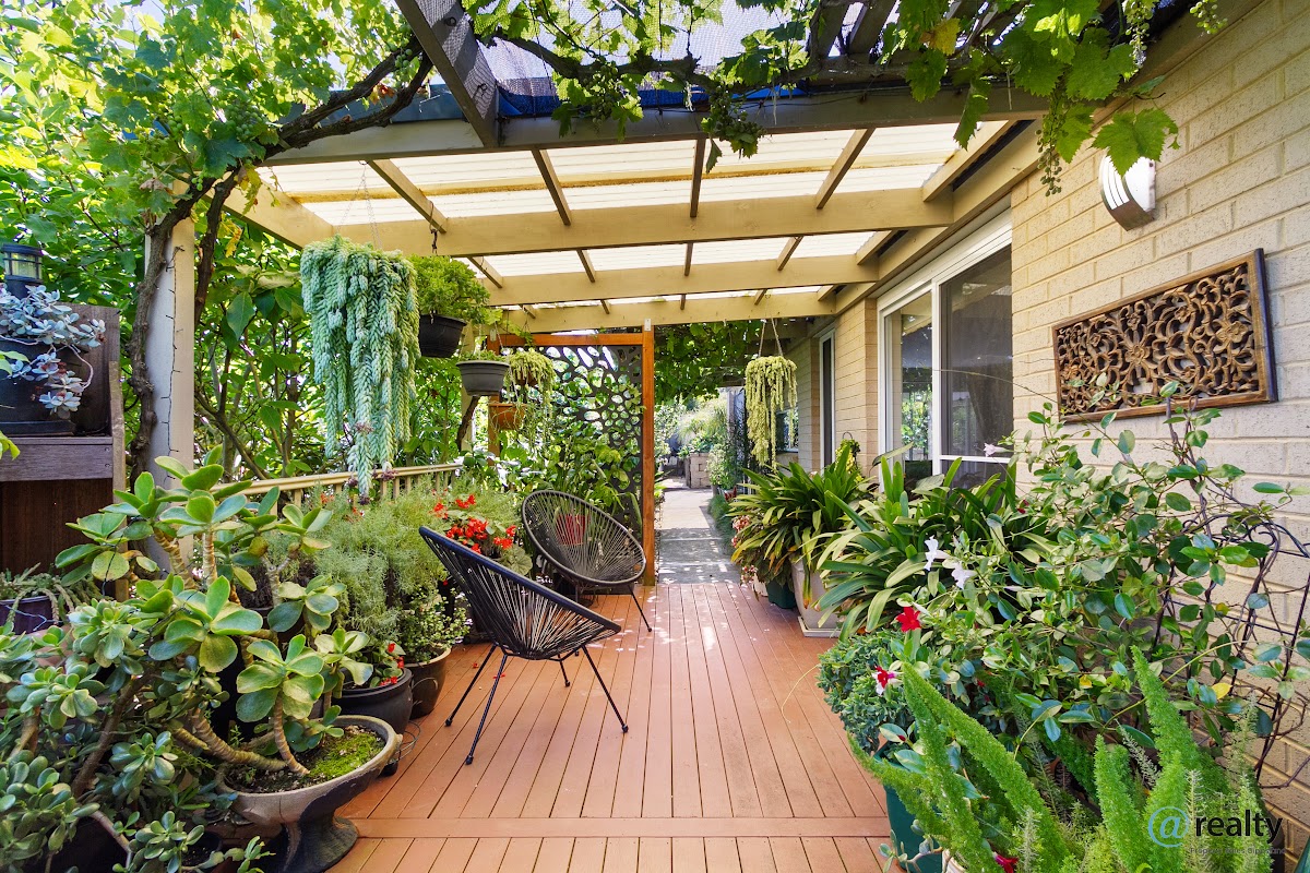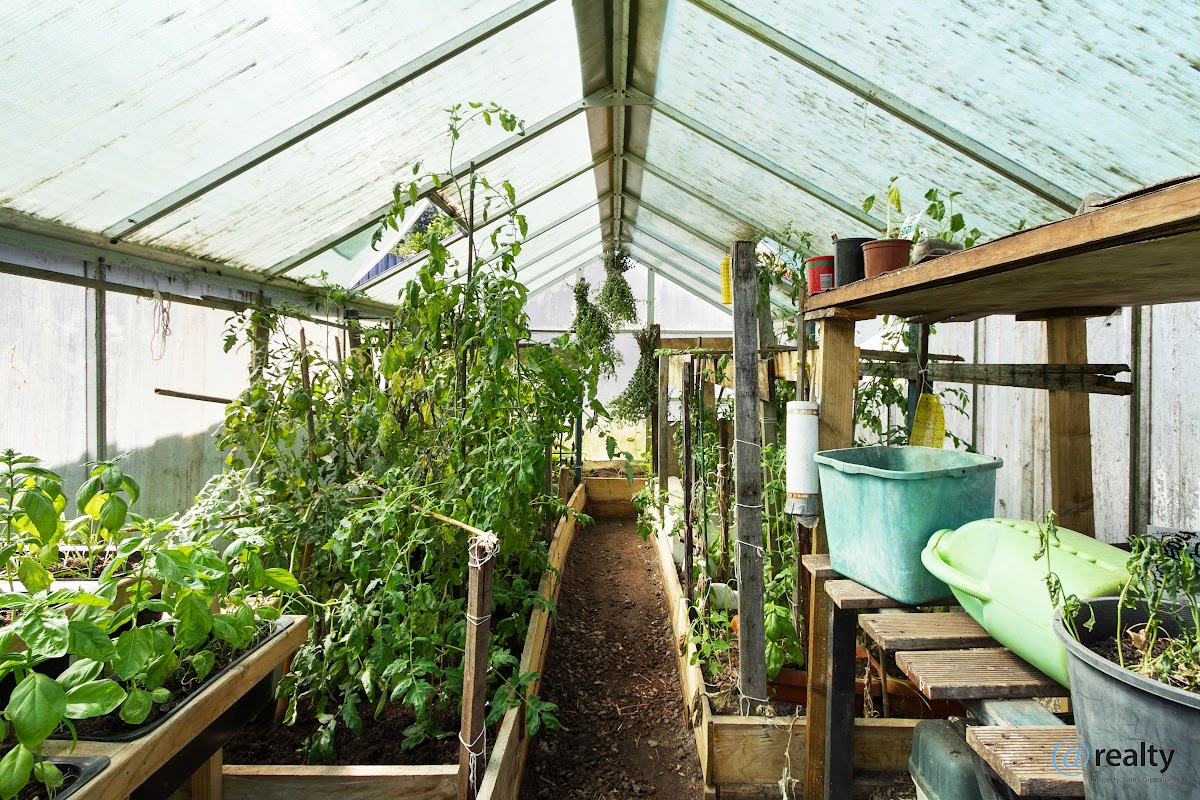 – A bright, open-plan living room that flows effortlessly to an outdoor undercover area, surrounded by mature landscaping, fruit trees, a vegetable garden, a shed, and a glasshouse.