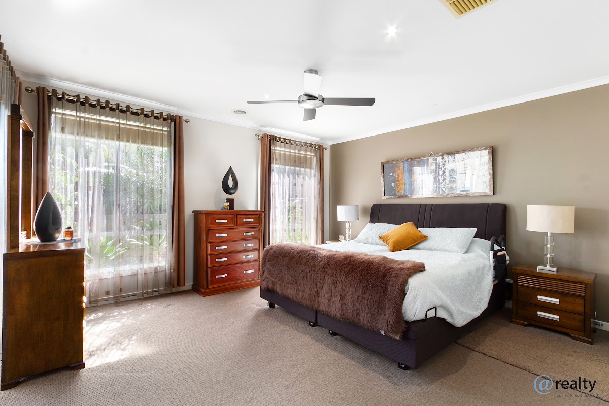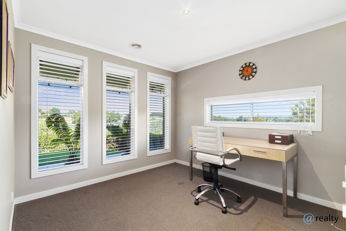 The home includes three spacious bedrooms and a home office that could easily serve as a fourth bedroom. The master suite features a walk-in wardrobe and an ensuite, while the other two bedrooms, equipped with built-in wardrobes, are serviced by a family bathroom.