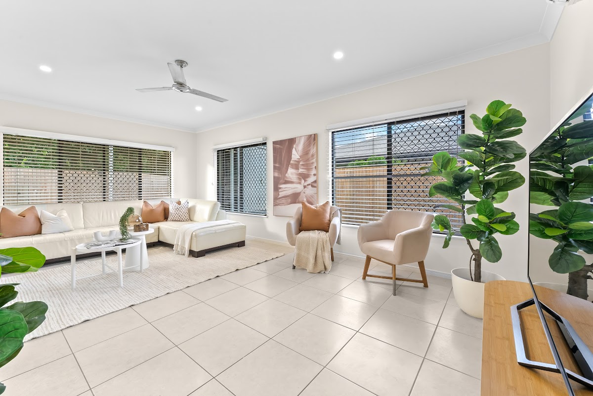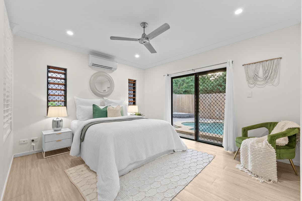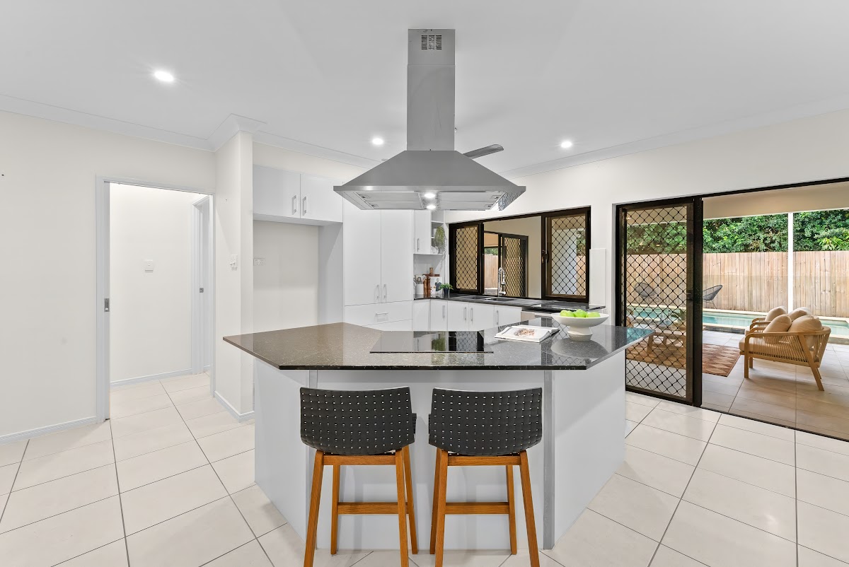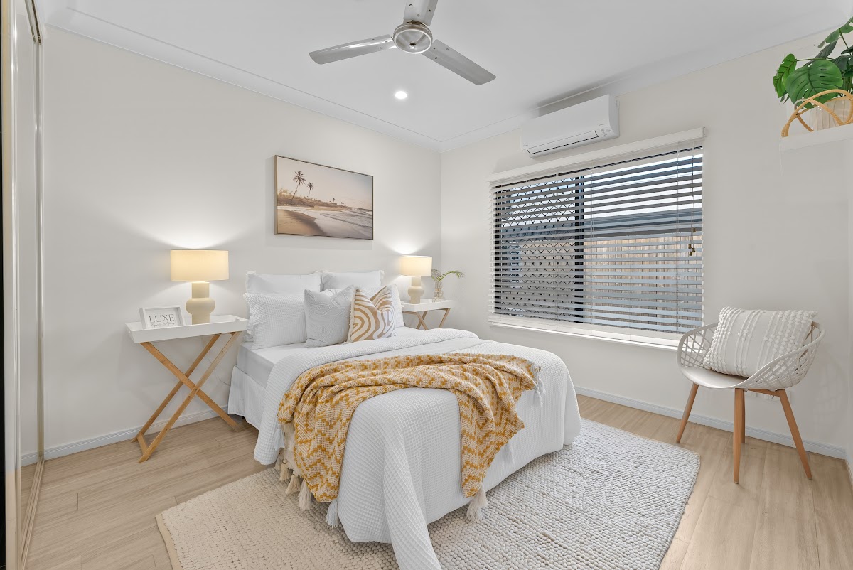 – Contemporary, fixtures and neutral colour scheme throughout with lovely tiled floors to all living spaces, practical vinyl floors to bedrooms, white venetian blinds and timber louvre windows, perfect for our tropical climate