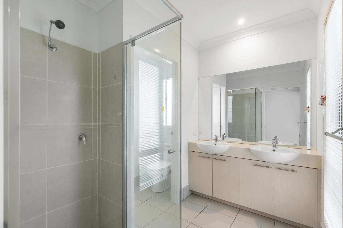 Downstairs, the master bedroom boasts an en-suite with dual basins, walk-in wardrobe and rear garden access via sliding doors. A second room is also adjoined by its own walk-in robe, with the remaining two bedrooms having built-in wardrobes with mirrored doors.
