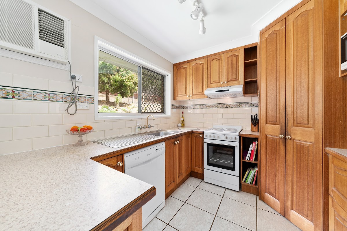 – Solid timber Kitchen has electric cooking and dishwasher.