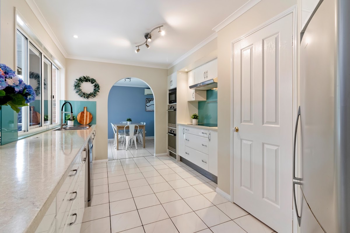 Step inside to a naturally illuminated open-plan layout featuring a fully tiled, air-conditioned lounge, living, and dining area that seamlessly integrates with a modern galley kitchen. Boasting dual ovens, 2-pak cabinetry, glass splashbacks, and large window views of the expansive undercover entertaining area, this space overlooks low-maintenance, terraced gardens encircling a stunning inground pool – an absolute entertainer’s dream!