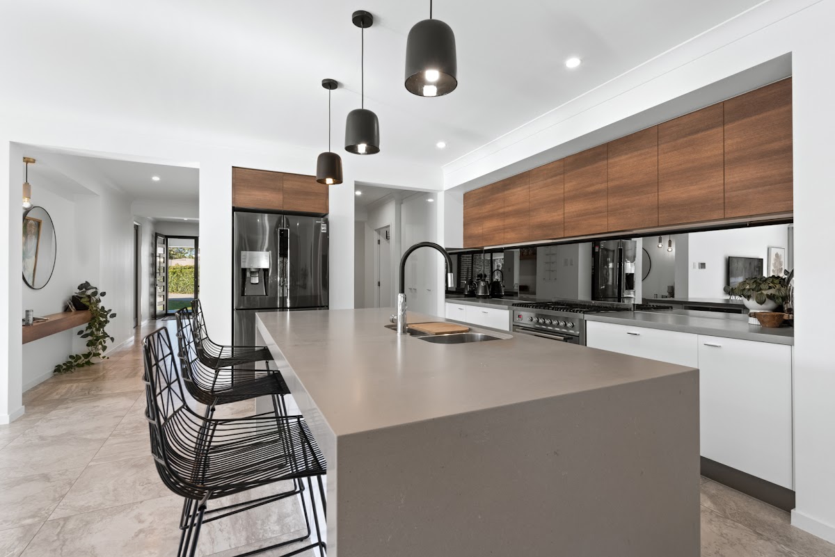 – Luxurious kitchen with 40mm caeser stone waterfall bench tops, 900mm free standing gas cooktop and mirrored splash back