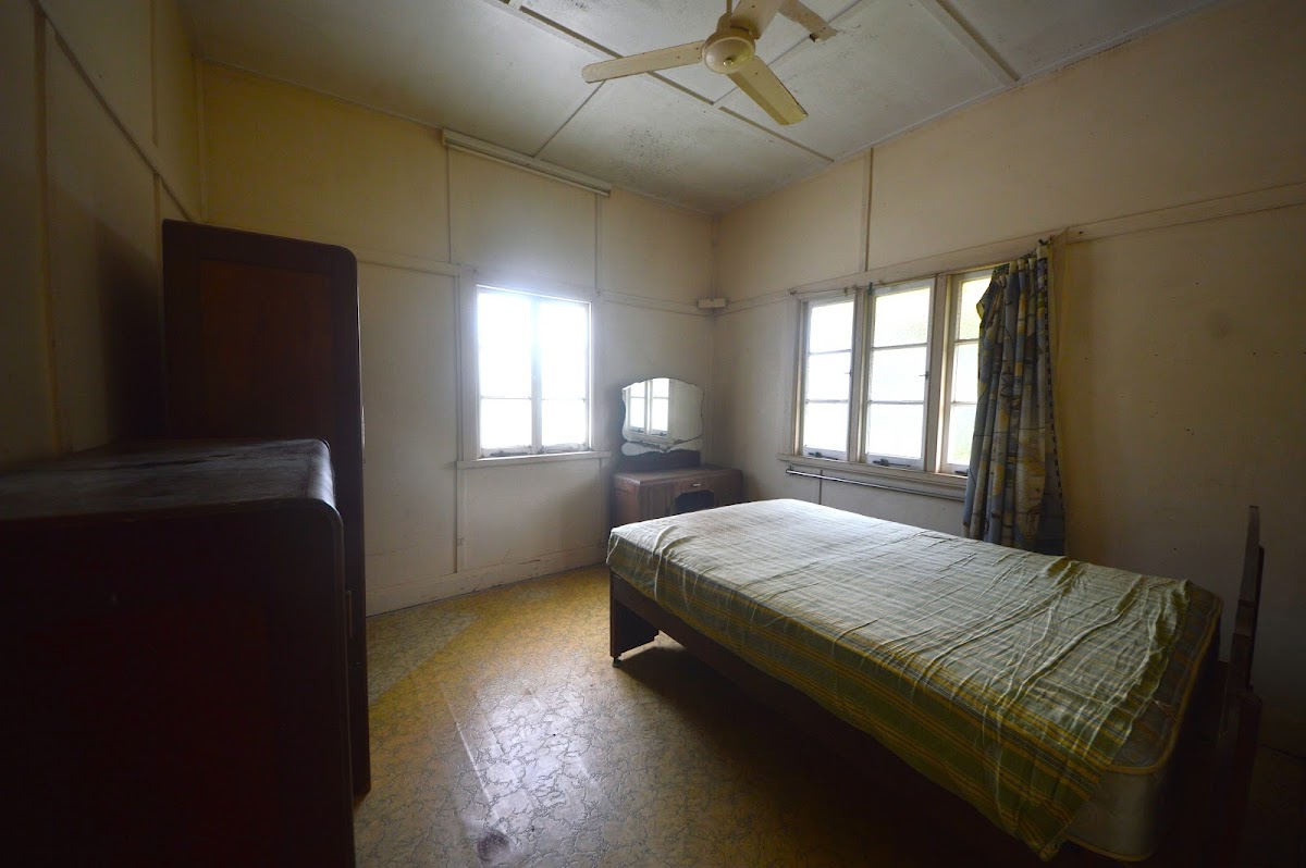 The home is a classic highset 2-bedroom Queenslander with solid hardwood floors and framing, high ceilings, and a versatile extra room that could serve as a third bedroom, home office, or rumpus. The house has a new roof, and while it needs repairs or renovation, the structure offers a solid canvas for transformation. Asbestos is present but considered safe if left undisturbed and managed properly.