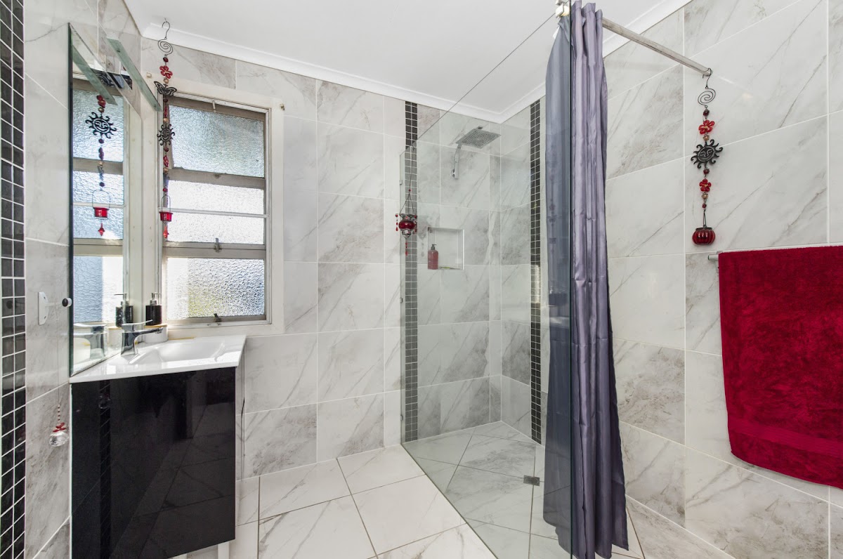 The beautiful fully renovated bathroom is a sanctuary with its sleek design and oversize shower.