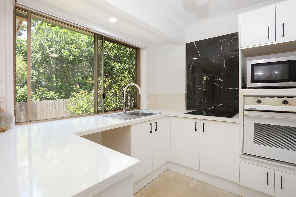 The kitchen is compact but functional, offering stone benchtops, a large window and a good amount of storage.