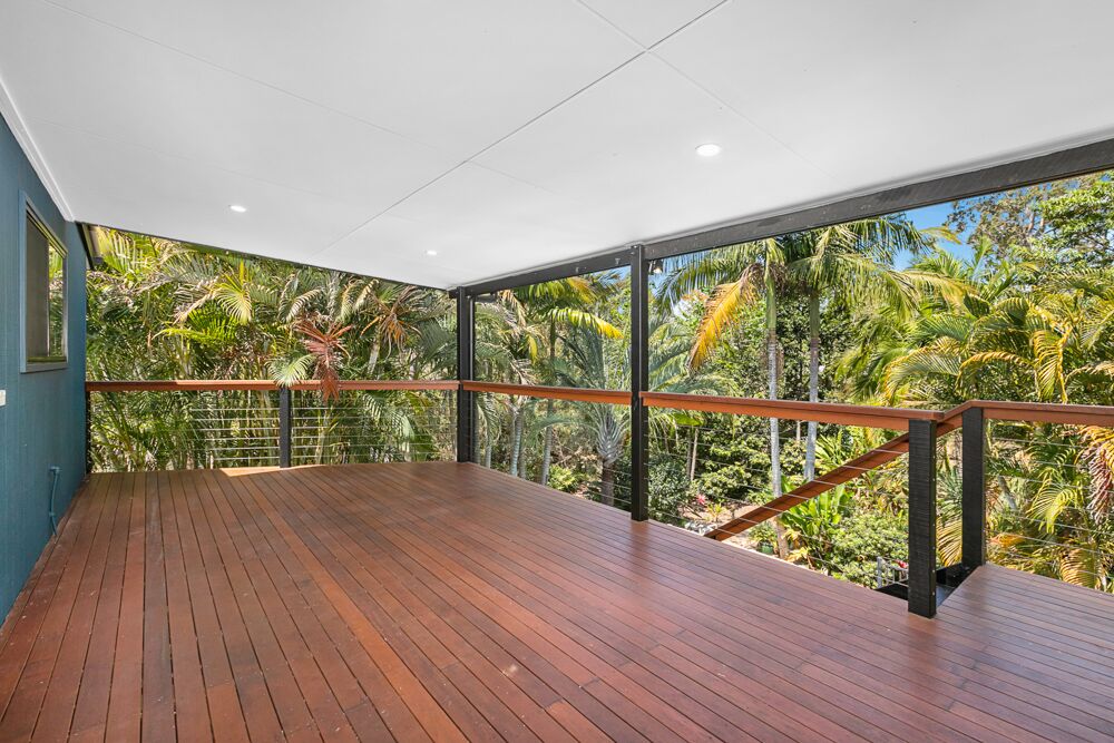 * broad, well-shaded rear deck looking into the tree-line & overlooking gardens, grounds & pool