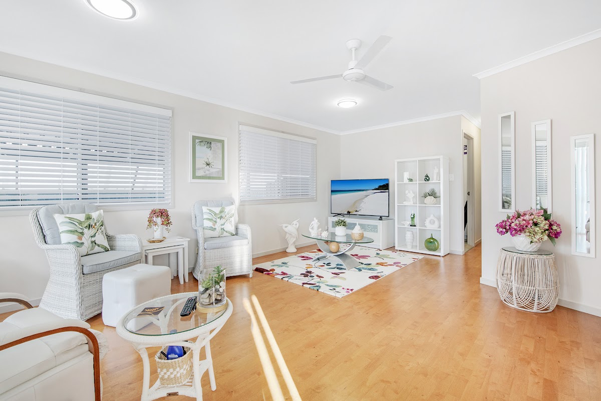 Redgum Coombabah has 250 homes in total and it is a Park of Manufactured Homes – an Over 50’s friendly Park that is pet friendly. The Site Fees are approximately $198-00 per week which is comparable to most Over 50’s in the area. There are no Entrance or Exit Fees when you purchase, no Stamp Duty or Council Rates as you purchase the home only and Lease the land – hence Site Fees. More information is readily available by speaking to me personally by phone , via email or at a private inspection appointment.
