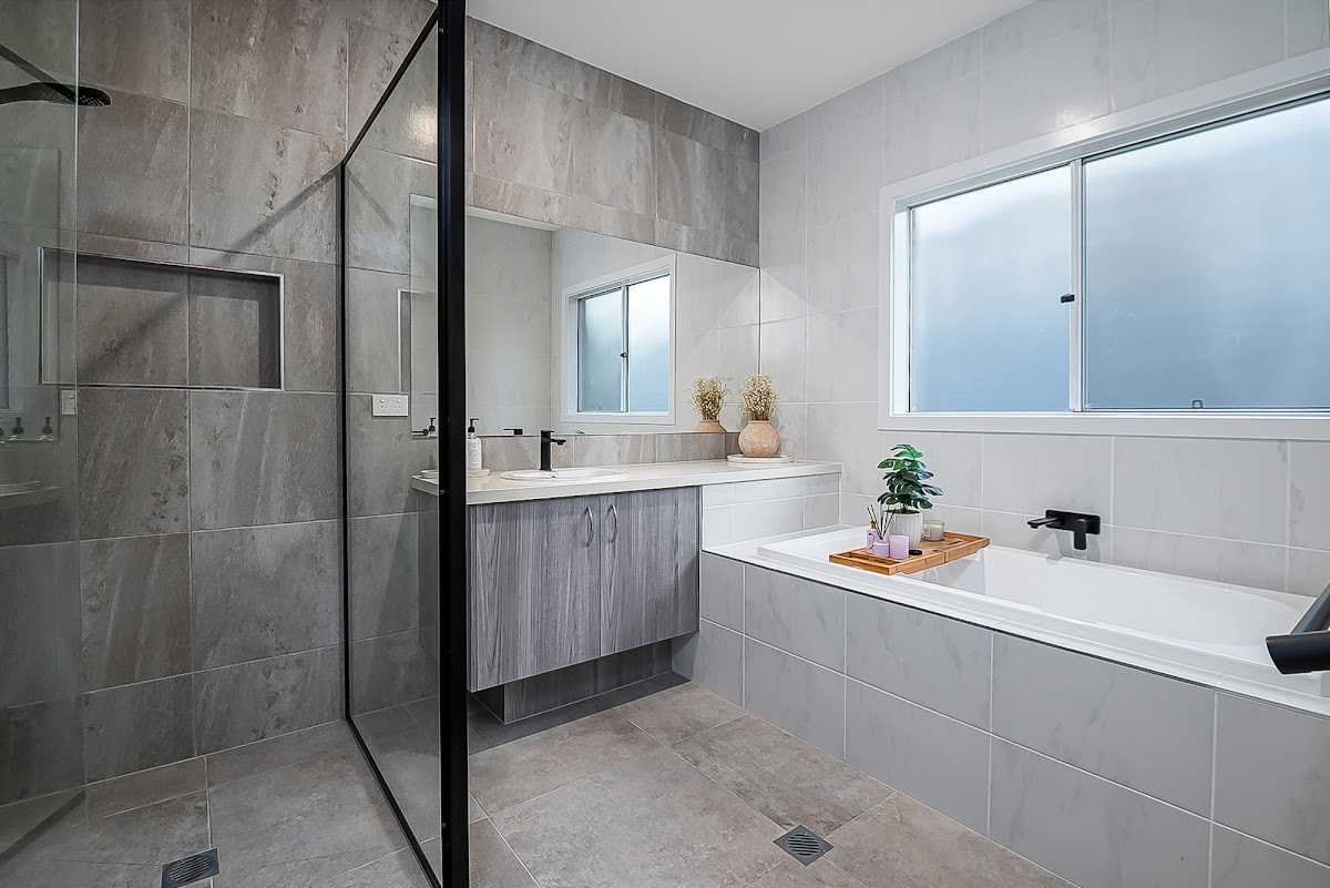 • Bathroom luxury: Semi-frameless slim black powder-coated shower screens, wall-niches, 40 mm stone-top vanities, quality tapware & mixers.