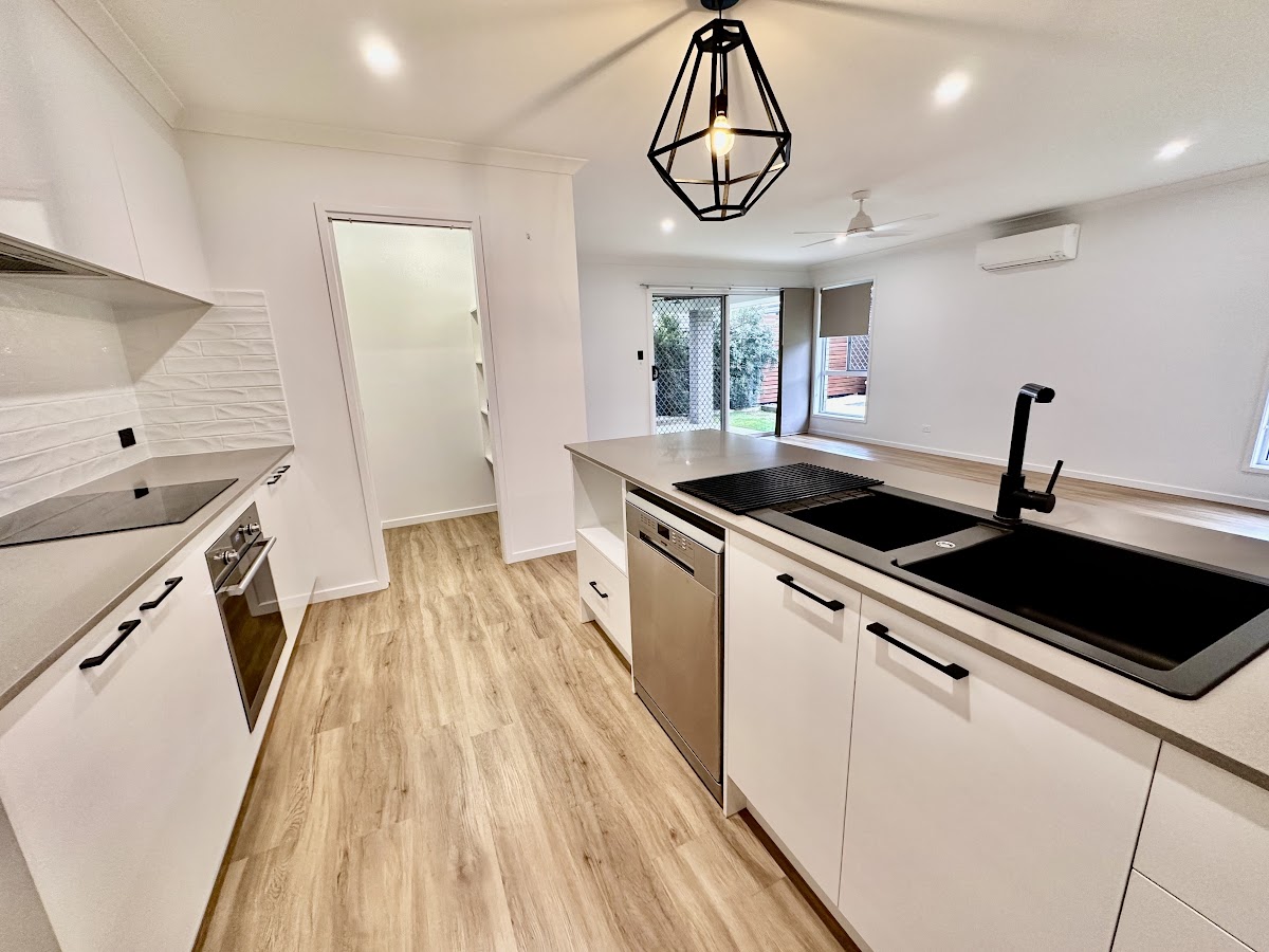 The Kitchen has loads of bench space a walk in pantry , pendant lighting , induction cooktop , rangehood ,