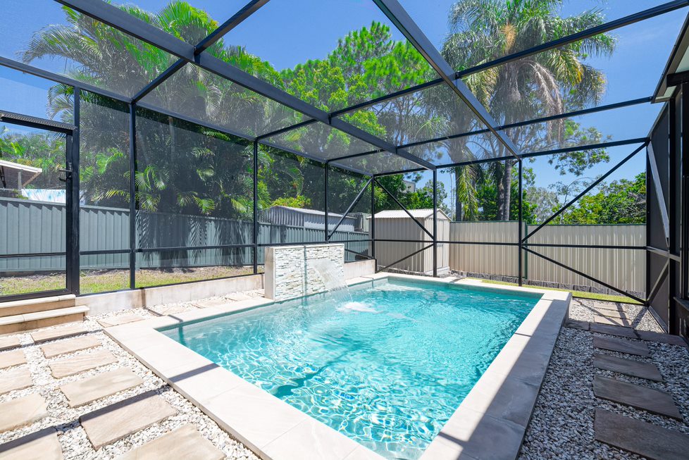 A large Deck with insulated roofing runs off main Living area providing massive space for entertaining. and overlooks the luxurious in-ground pool.