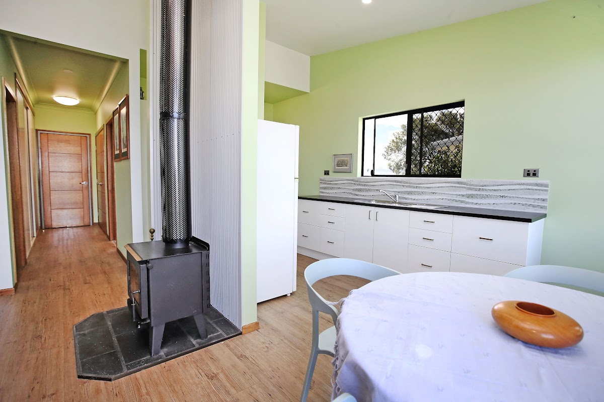 Inside, the home exudes warmth and coziness, especially during the cooler months, thanks to the inviting wood heater. The raked ceilings add a touch of elegance and spaciousness, enhancing the overall ambiance. Vinyl floors throughout the house provide a practical, easy-to-maintain surface that perfectly complements the country aesthetic.