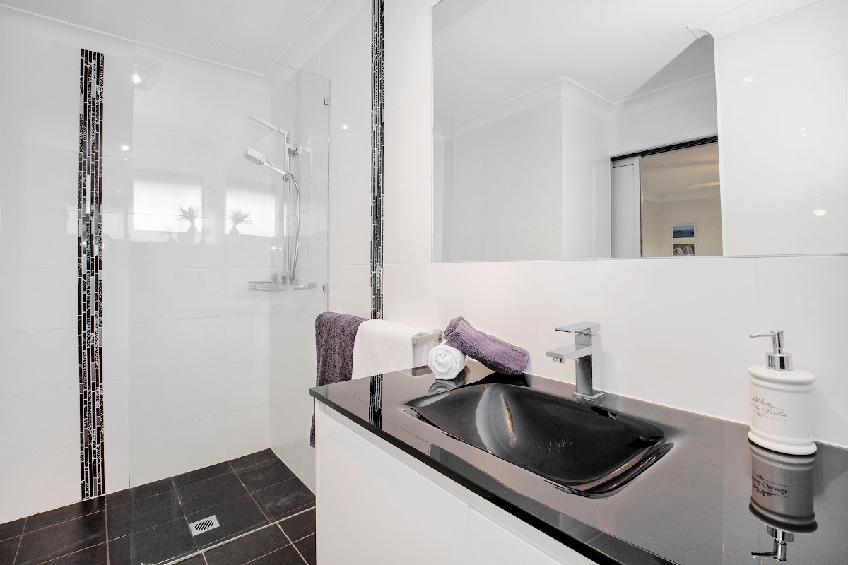* Shimmering north facing, fully tiled in-ground swimming pool, surrounded by frameless glass fencing.