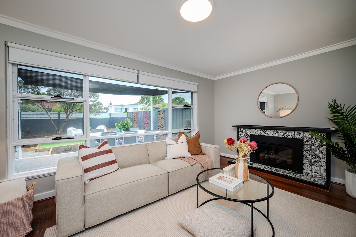 Living area at the front of the home with views to the outside patio and lawn space