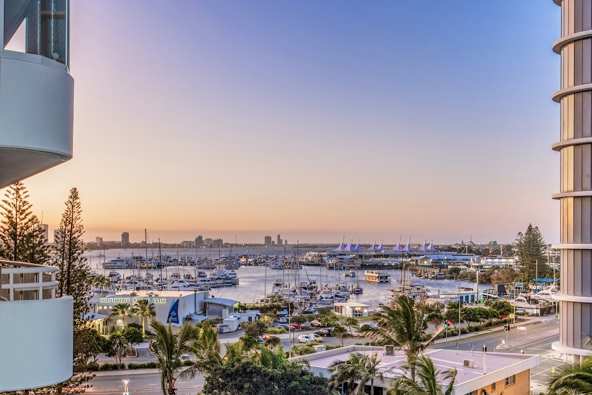 Open-plan living spills onto a sun-drenched balcony with ocean, beach and Broadwater views. Imagine balmy evenings sipping rosé as the sun dips below the horizon, painting the sky in fiery hues.