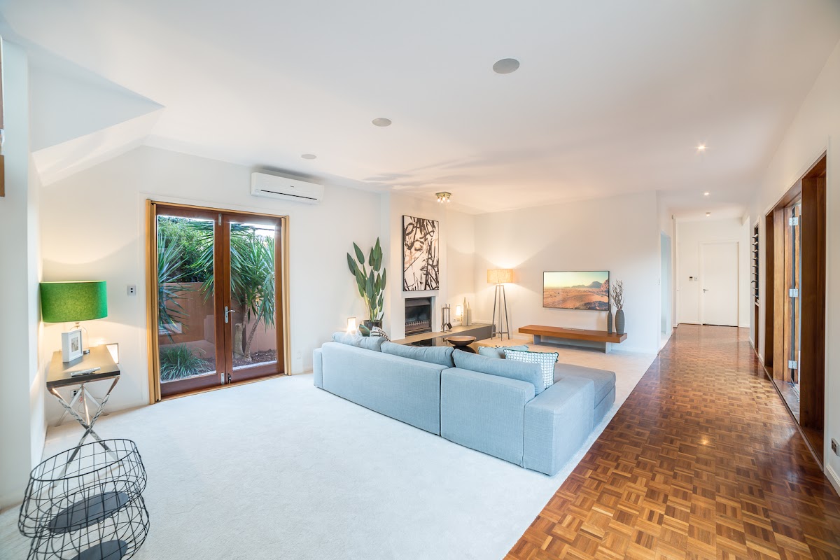 Spacious light filled lounge room with open fireplace, and French doors embracing outdoor vistas