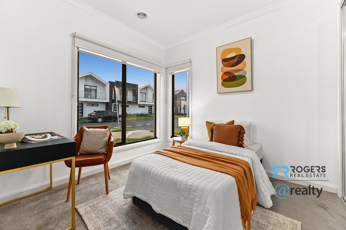 The spacious master bedroom offers the ultimate retreat, with plush carpet, double blinds, and downlights. The room also features ducted heating and evaporative cooling, a walk-in robe, and an en-suite with a large shower cubicle, a double vanity topped with 40mm Caesarstone, and soft-close cupboards for added luxury.