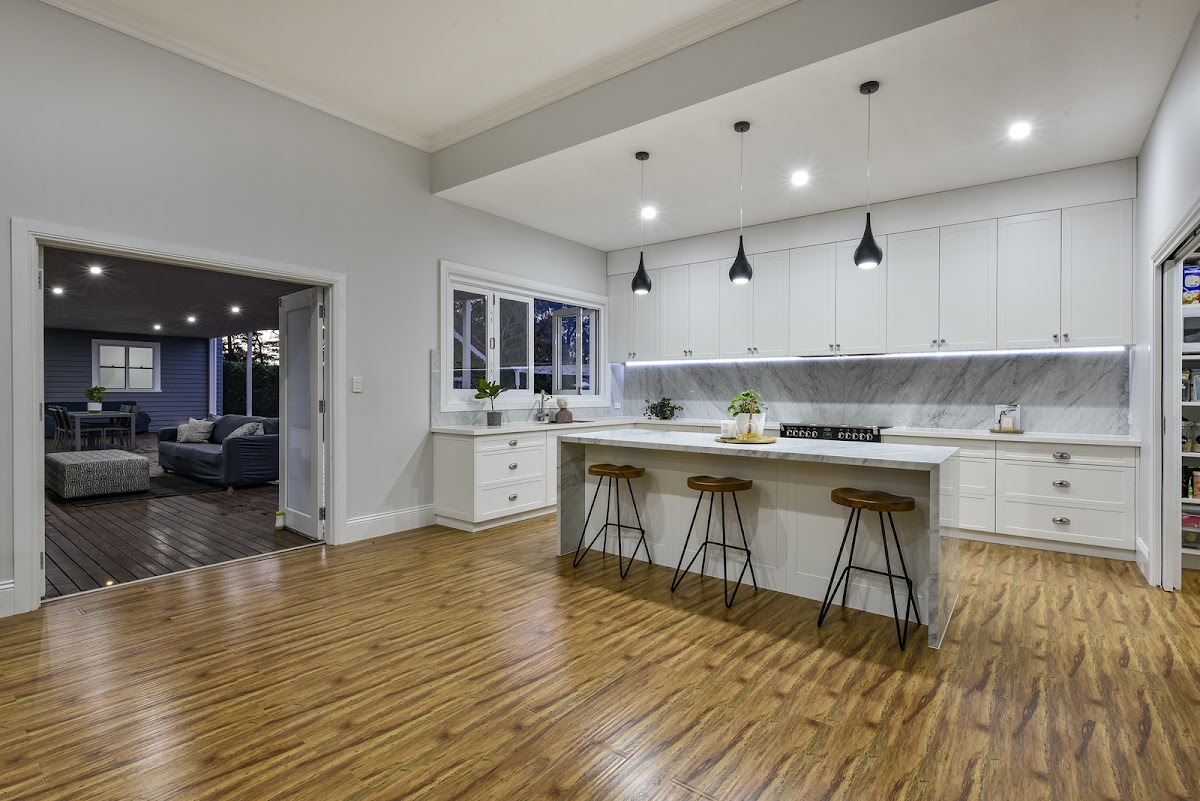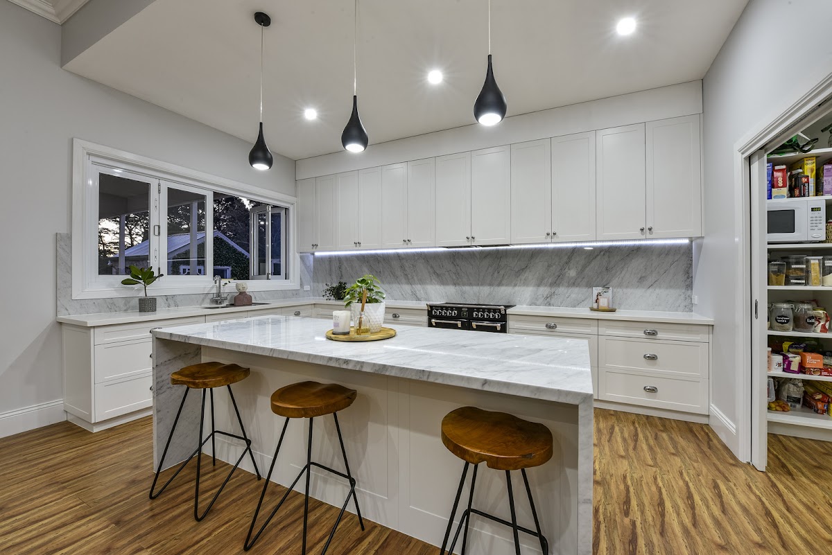 AN OPEN KITCHEN MEALS FAMILY ROOM IS THE HEART OF THE HOME, COMPLEMENTED WITH A STUNNING KITCHEN, WITH MARBLE BENCH TOPS AND SPLASH BACKS, SOFT CLOSE DRAWS, BUTLERS PANTRY, BELLING DOUBLE TOP STOVE AND GRILL.