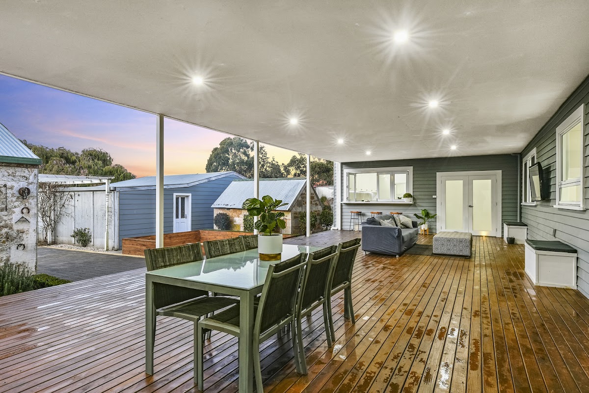 FRENCH DOORS FROM THE KITCHEN LEADS TO HUGE DECKING ALFRESCO AREA, ENCLOSED ON THREE SIDES, AND LOOKING NORTH OVER BEAUTIFUL GARDENS CAPTURING THE WINTER SUN.