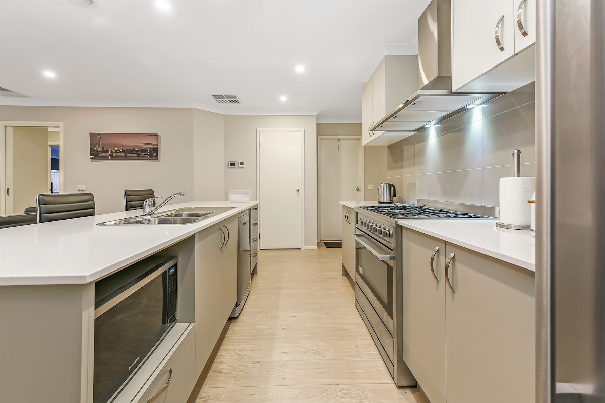 Featuring a well-appointed central kitchen with 900mm stainless steel appliances and dishwasher with Caesar stone benchtops in a neutral décor.